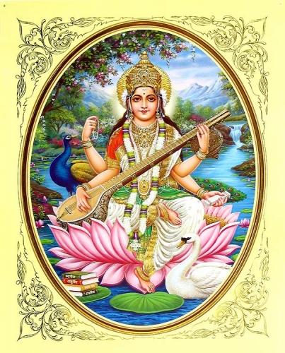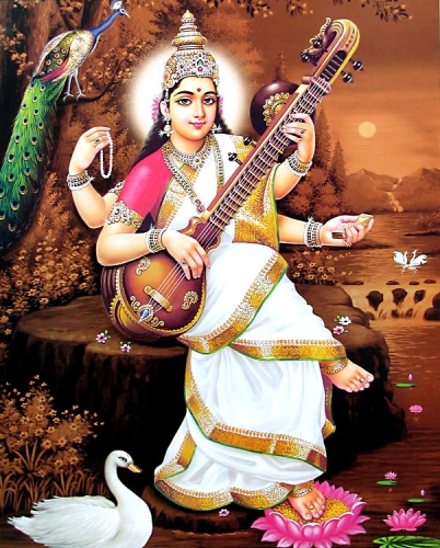 พระแม่สรัสวตีเทพเจ้าแห่งนักปราชญ์เทวีแห่งสติปัญญาและความงามการสร้างสรรค์สรรพสิ่งการดนตรี และมนต์ตรา