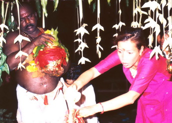 ต่อมาอีกหกเดือน ข้าพเจ้าก็ได้พบผู้หญิงชุดแดงในนิมิตรอีก ท่านมาบอกตัวเลข รุ่งขึ้นก็ลองไปซื้อล็อตเตอรี่ตามนั้น ปรากฏว่าถูกรางวัลเป็นจำนวนมาก และเป็นเช่นนี้เรื่อยมา น้อยบ้างมากบ้างซึ่งสามารถนำเงินนั้นมาก่อสร้างวัดได้จนถึง 1ปีเต็ม จนอาจารย์กุมมาลัน ได้มาปรารภกับข้าพเจ้าว่าจะจัดพิธีนวราตรีขึ้นในวันที่ 17 ตุลาคม 2540 ซึ่งเป็นวันศักดิ์สิทธิ์ของพระแม่ทุรคาหรือพระแม่กาลีที่ออกรบกับอสูรร้ายจนมีชัยชนะ ทางคณะกรรมการในขณะนั้นมีอยู่ 10ท่านจึงได้เตรียมกันจัดงานขึ้นเป็นปีแรก และได้ตั้งเป็นชมรมชาวฮินดูชื่อว่า "วัดพระแม่กาลี" แต่พอถึงงานวันนวราตรีวันที่ 2 เสด็จแม่ได้ใช้กายสังขารของคุณนาคราชซึ่งเป็นชาวศรีลังกาประทับทรงและตรัสสั่งกับคณะกรรมการทุกคนว่า สถานที่แห่งนี้ควรมีชื่อว่า "ศรีนาคาทุรคาเทวี" และในงาน 3 วันแรกควรบูชาพระแม่ทุรคา วันที่ 4 บูชาแม่ลักษมี วันที่ 5 บูชาแม่สุรัสวดี วันที่ 6.7.8 บูชาพระแม่ทุรคา และวันสุดท้ายคือวันกาวดีของพระแม่ ข้าพเจ้าจึงจัดขบวนขึ้น 3 ขบวน คือ 1.พระพิฆเนศวร์ 2.พระขันธกุมา 3.ขบวนของพระแม่ นับแต่นั้นเป็นต้นมาจวบจนถึงปัจจุบันมิเคยขาด และการดำเนินการก่อสร้างวัดก็เป็นไปเรื่อยๆด้วยหัวใจที่ศรัทธาและเคารพรักต่อเทพในทุกๆพระองค์